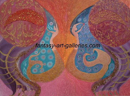 This is a painting which combines mythology with astrology. The two mermaids never seem to face each other while each bear their gift to the worlds. The mermaids form an underwater Gemini to reflect the sky above them just as the reflection between them. Each mermaid has a gift to bear to the worlds.